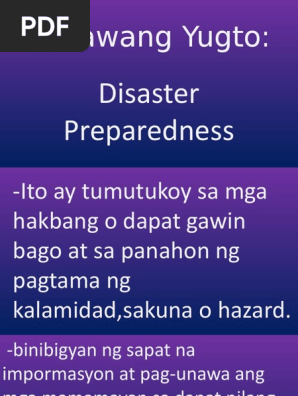 Tumutukoy sa mga hakbang o dapat gawin bago at sa panahon ng pagtamang kalamidad sakuna o hazard. Ikalawang Yugto Disaster Preparedness Ito ay tumutukoy sa mga hakbang o dapat gawin bago at sa panahon ng pagtama ng kalamidad sakuna o hazard. Kailangang ikonsidera rin ang badyet sa pagsasagawa nito plano ng dapat gawin mahalagang iplano ito nang mabuti ayon sa tamang pagkakasunod-sunod ng pagsasagawa nito kasama ang mga taong kakailanganin sa pagsasakatuparan ng mga gawain.